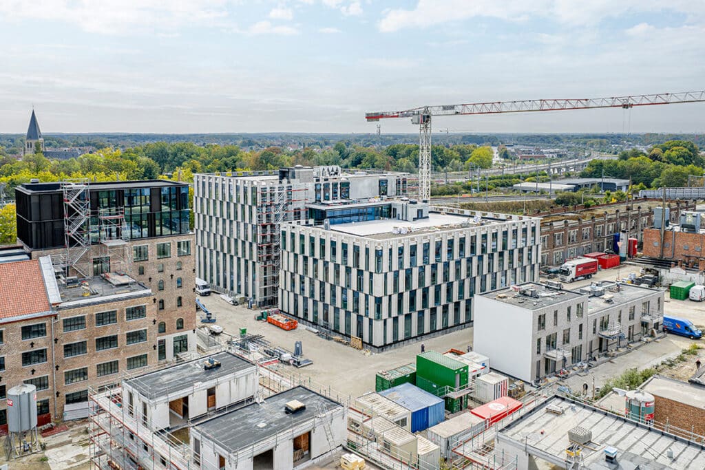 “De bedoeling van de projectontwikkelaars was een nieuw stadsdeel te creëren waar wonen en werken in een mix van erfgoed en nieuwe gebouwen kan plaatsvinden”, vertelt Raf Boogers, projectmanager bij AB-Eiffage. “Dit moest op een uiterst duurzame en toekomstgerichte manier gebeuren, want de investeerders wilden niet minder dan een BREAM Excellent-certificaat behalen. Daarom werd besloten om door middel van een warmtenet de gebouwen te verwarmen en te koelen. Ook werd een maximum aan ecologische materialen toegepast, zoals FSC-gelabeld hout. Verder zijn slimme mobiliteitsoplossingen voorzien: dankzij een ondergrondse parking van meer dan 10.000 m² is de site volledig autoluw. Last but not least zal de site over bijzonder veel groen beschikken, met zowel binnen- als buitenruimte om te ontspannen.”