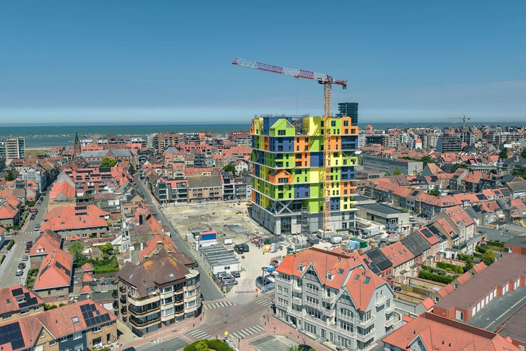 In Knokke-Heist verrees op zo’n 300 meter van de zee Hoost, een expressieve woontoren met een gevel die daglicht vangt in een spel van kleur, ritme en reliëf. Het ontwerp breekt bewust met de klassieke kustarchitectuur. Achter dit visuele statement schuilt een complexe realisatie die tot in het kleinste detail werd beheerst.