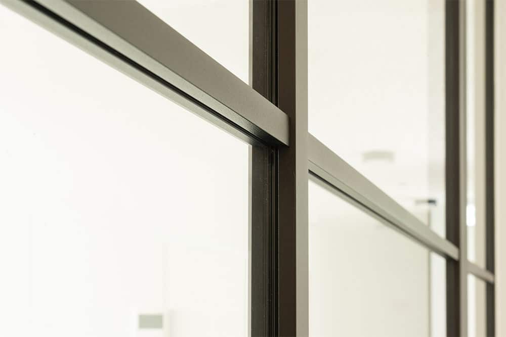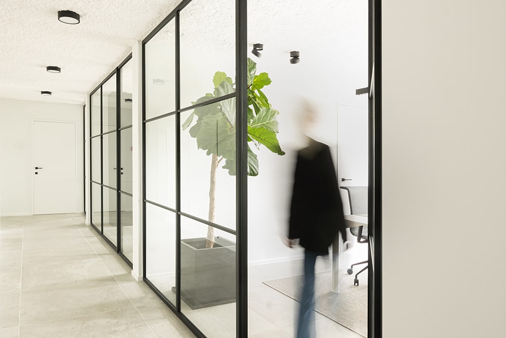 Met dat ontwerp trok Van Hool onder meer naar Glaswerken Van Regenmortel. De ervaren plaatser presenteerde enkele mogelijke oplossingen voor de glazen tussenwanden en deuren. Uiteindelijk viel de keuze op divina van ARLU. “Dit systeem sloot het best aan bij de wensen van de bouwheer omdat de deur maar naar één kant opengaat en een aanslag heeft. Er zijn dus geen spleten naast de deur, in tegenstelling tot bij een pivotdeur. Bovendien zijn er geen vijzen of scharnieren zichtbaar na de montage, wat bijdraagt aan de esthetiek van het geheel”, legt medezaakvoerder Julie Van Regenmortel uit. “Tegelijk garandeert het divina-systeem dat de wand ook met de deur open nog steeds mooi doorloopt.”