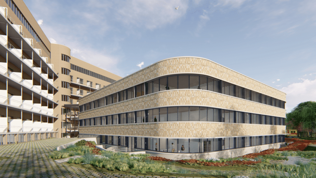 “Daardoor past het nieuwe gebouw zich met een eigen, maar ondergeschikte identiteit in binnen de bestaande gebouwde campus,” aldus Philippe Van Goethem. De horizontale banden zijn aangebracht in verticaal metselverband, met ter hoogte van de vloerplaten enkele dieperliggende horizontale lagen. Ter hoogte van de horizontale bandramen komt een buitenzonwering, samengesteld uit horizontale lamellen. “De bediening ervan zal mogelijk zijn per kamer.”